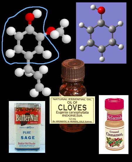 Spices contain essential oils that have antimicrobial properties. Many of these oils are derived from a compound called phenol. In the upper right of the picture, the 6 gray balls are carbon atoms. The small white balls are hydrogen and the red ball is oxygen. This molecule is called phenol and is used as an antiseptic and disinfectant. In plants, additional compounds are bonded to the phenol to produce a wide variety of chemicals many of which are antimicrobial. The other molecule shown is eugenol, which is an essential oil found in cloves, sage, and cinnamon. It has good antimicrobial properties. The circled part of the molecule shows that phenol is part of its makeup. |