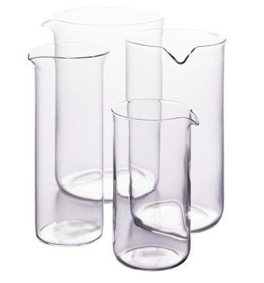 B. Cylindrical objects. For cylindrical objects, the formula for the volume is V=pi x radius squared x height (V=πr²H). πr² is the area of a circle. Multiplying area of the circular top (or bottom) by height (H) gives you the volume of a cylinder. For example, these beakers have no markings to show their volume. You could measure across the base to find the diameter. Divide the diameter by 2 to get radius. You would then measure the height of the beakers up to their spout. If your measurements are all in centimeters, then your answer will be in cubic centimeters (milliliters). |