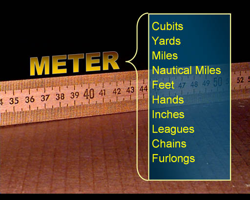 LENGTH: The great thing about the meter was that it could replace all of these other units for measuring distances. These other units were just a hodgepodge of ways that things got measured. Most people only know a few of these and cannot easily convert between one and the other. In metrics, the conversions are always a multiple of 10. |