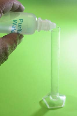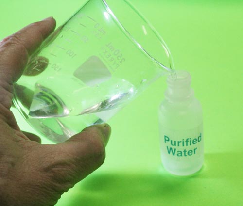 The Purified Water bottle holds about 30 ml of water, so place enough in the beaker to fill up the Purified Water bottle. After pouring remember to put the dripping nozzle back onto the Purified Water bottle. |
