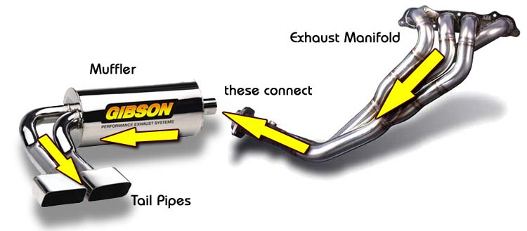 | In the above picture, the exhaust manifold is the first set of pipes that combine the exhausted gases from the cylinders into one pipe. The exhaust is then routed to the muffler to reduce the explosive sound that came from the gasoline exploding in the cylinders. A catalytic converter (not shown) comes before the muffler and converts unburned gasoline to carbon dioxide and water. The exhausts exits the tail pipes. It's at the tail pipe where we want to detect the water vapor. | |