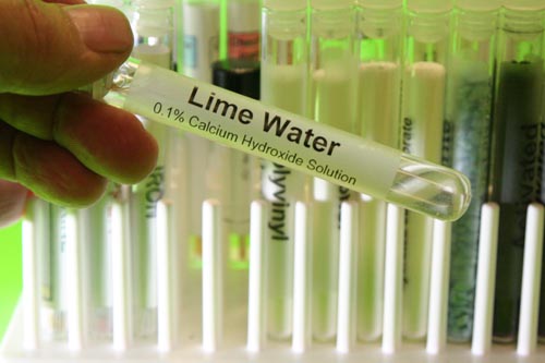 Locate the lime water test tube in your kit. Lime water is water that has the maximum amount of calcium hydroxide dissolved in it. That's about 0.1% w/v (meaning 0.1 grams calcium hydroxide in 100 ml of water). It's a weak alkaline solution. |