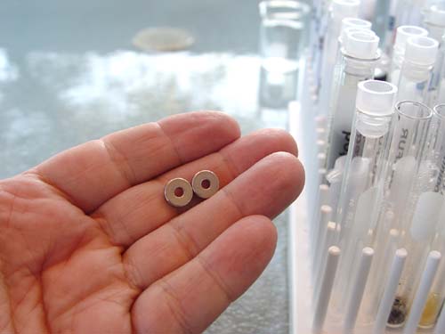 In this lab, you will see for yourself the effectiveness of magnets in water softening. These magnets are small but are neodymium magnets, which are the strongest permanent magnets made. It's the same kind of magnet that often gets mentioned in the magnetic water "conditioning" ads. |