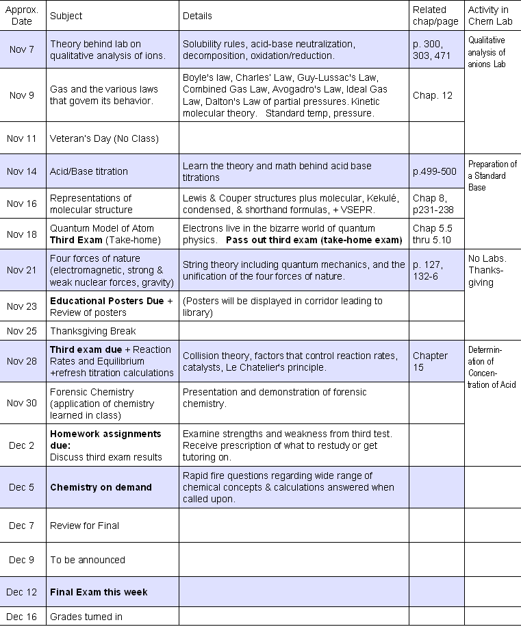 arbitrary. With this said, we can use points because it is easy to work with, but it is only approximate. People who focus only on learning the subject do better than those who worry about grades. That’s because when you worry about points and grades, you are not thinking about the subject. Listen and learn in class and grades will take care of themselves. In case you are still interested, here is the breakdown of points that will serve as a guide to your grade Daily quizzes (Attendance): 100 points3 tests: 100 points each totaling 300 pointsFinal test: 100 pointsPoster project: 100 pointsMiscellaneous assignments: 100 points Total: 700 points Grades are 90-100%=A, 80-89%=B, 70-79%=C, 60-69%=D, Below 60%=F If your points are close to a better grade, I will always give you the benefit of the doubt and give you the better grade because, like I said, grading is not that accurate. Notice attendance is a big contributor to your grade because of all of the daily quizzes. If you miss an exam, I will handle it on a case-by-case basis. It all depends on the circumstances involved. I again apologize for this much attention drawn to tests and points. Being aware of them is good, but worrying or being fixated on them will actually take attention away from learning and hurt your grade. The best thing is to get interested in the subject and that motivation will help you do good on any tests that come your way. |