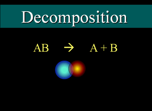 The synthesis reaction is normally represented by the letters "A" and "B" forming a compound represented by "AB". "A" and "B" could represent just two different elements, or they could be compounds (2 or more elements). (roll cursor over image for animation) |