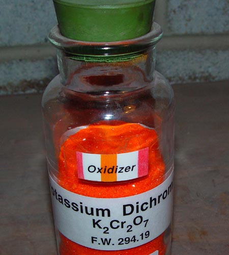 Chromates and Dichromates are usually colored. The word "chrom" means color, so it's no big surprise. When you see oxygens in the formula and "oxidizer" warning, that means the oxygens can come off to create a fire hazard. Here we have potassium dichromate. F.W. stands for formula weight, which also gets called molecular weight or molar mass. Just add up the atomic weights of Kx2, Crx2, and Ox7. |
