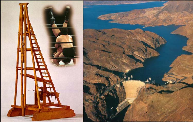 | On the left is a pile driver. A weight (the driver) is lifted up to the top of the rig. The weight now has potential energy. As it falls the potential energy becomes kinetic energy (moving energy). When it strikes the post (pile/piling) at the bottom, the energy is used to drive the post farther into the ground. It's a smart way to deliver a lot of force. Wrestlers use the pile driver maneuver by lifting the opponent and letting gravity do the work as the opponent falls to the mat head first. | On the right is Hoover dam. Lake Mead is held back by the dam. Lake Mead sits higher than the ground below the dam. This means the water in the lake has a lot of potential energy. This energy is tapped when water is allowed to flow downhill (kinetic energy) and spin turbines. |